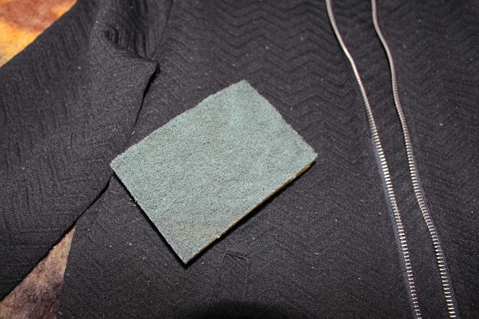 A dica é bem simples… você vai usar o lado verde da esponjinha. Uma esponjinha nova, ok? Dobre a esponja como na foto. Firme mas, sem apertar muito pressione a parte verde contra a peça, com movimentos retos no sentido da fibra do tecido. Repita algumas vezes, e você vai perceber as bolinhas se soltando.