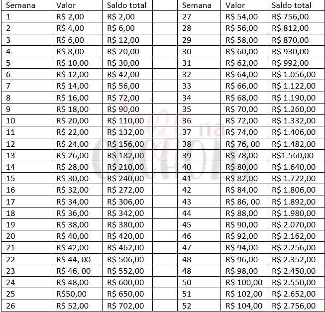 Pra ajudar vocês, aqui está a tabela do cofrinho progressivo. Você pode baixar pela fanpage do blog.