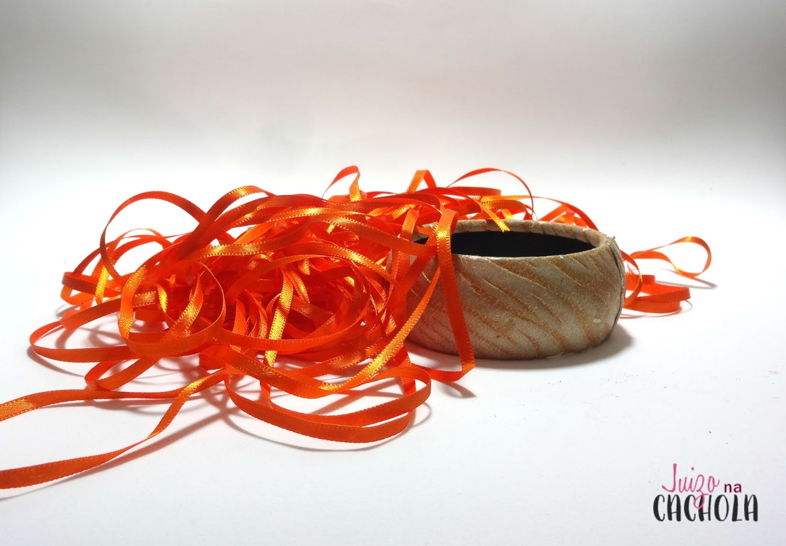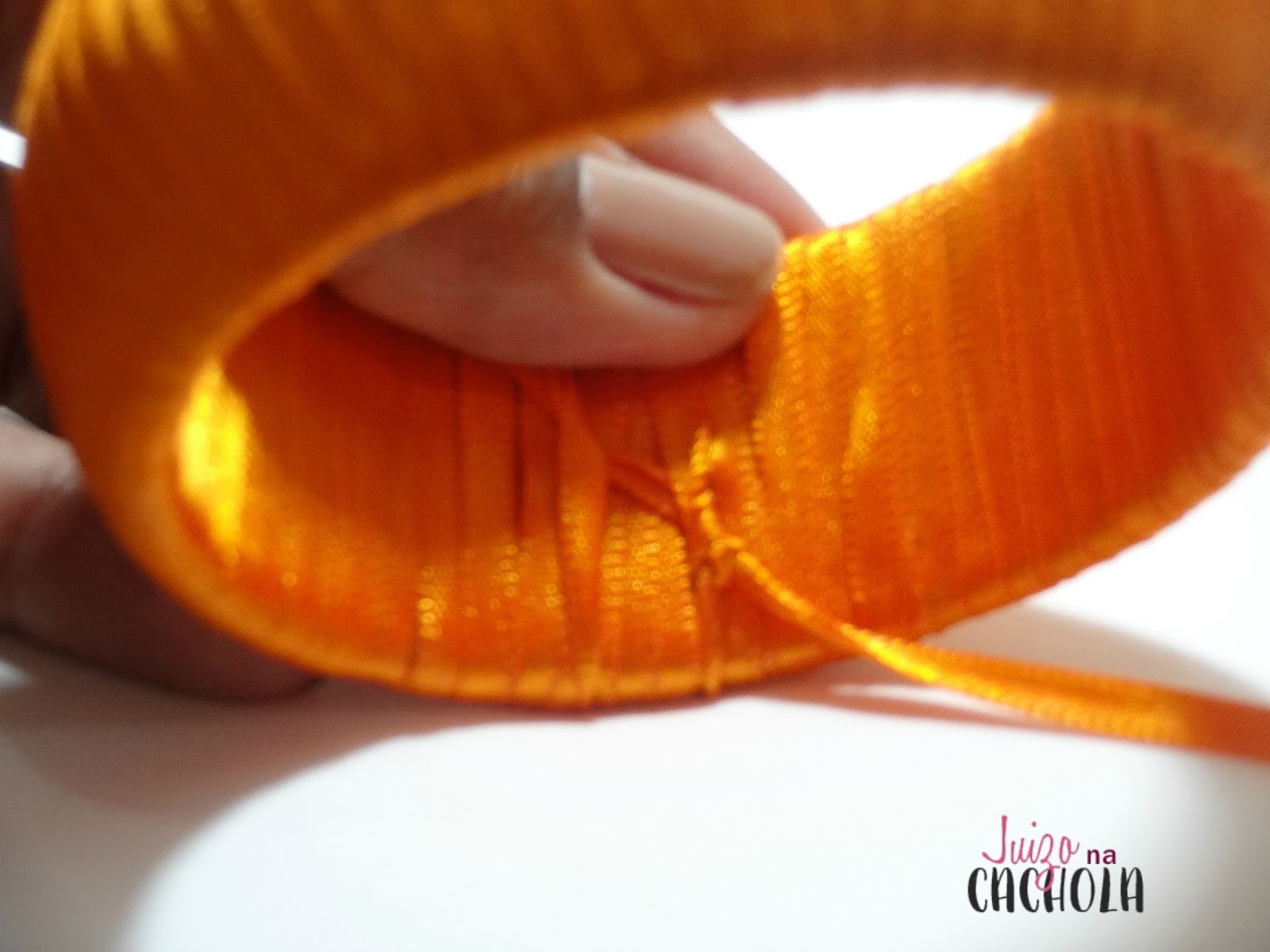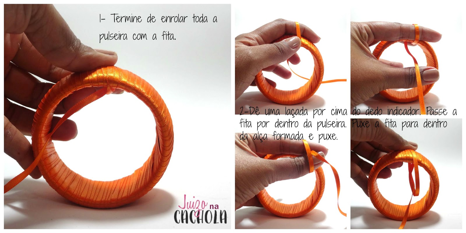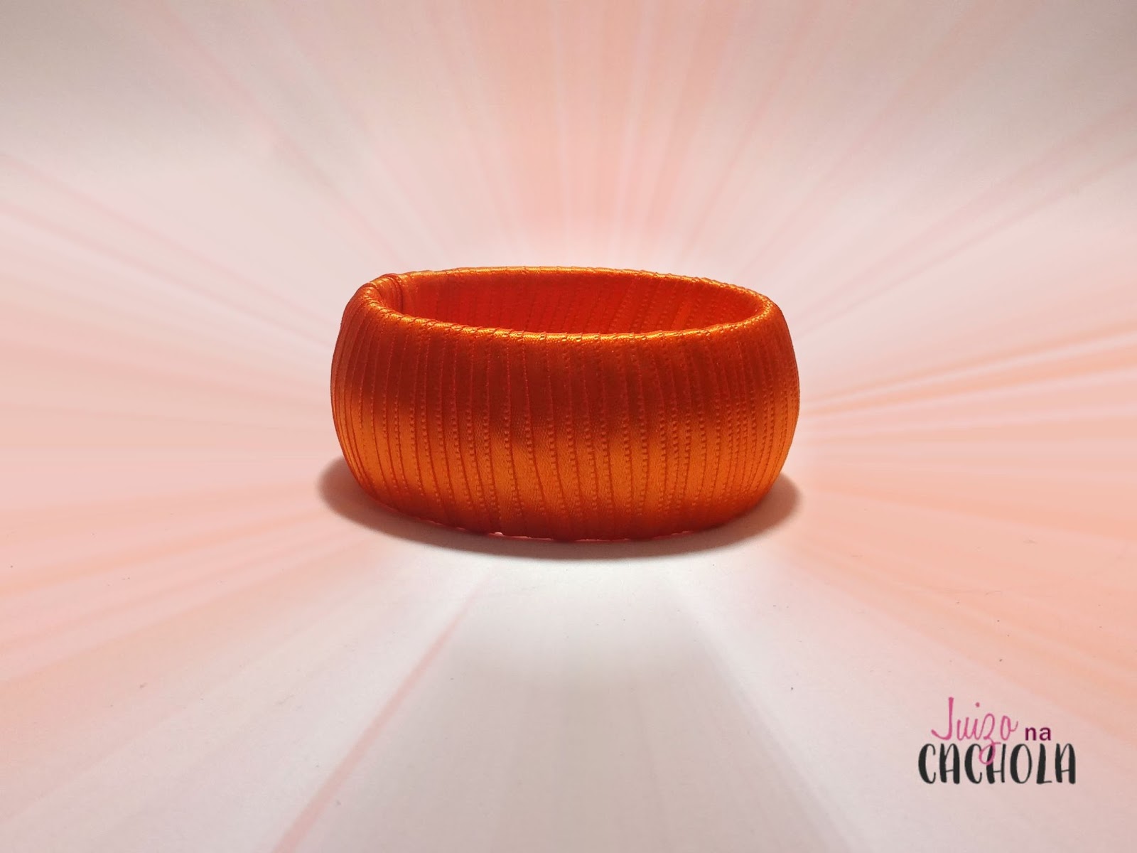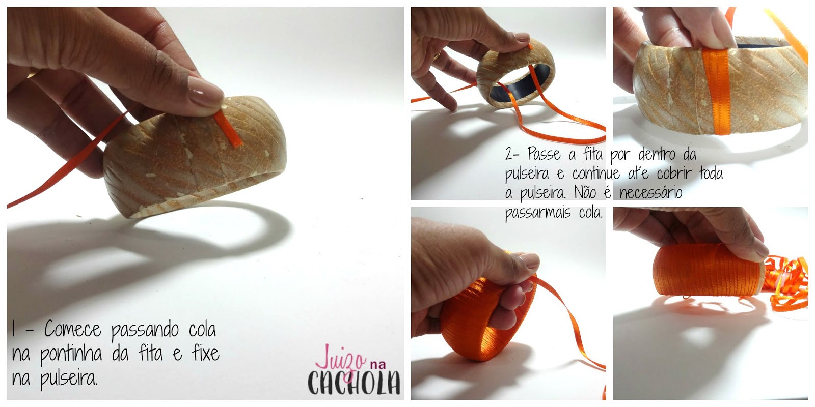 Escolhi a cor laranja, porque queria uma peça chamativa para se destacar em um look básico. Primeiro passe uma gota de cola na ponta da fita e vá enrolando a pulseira.