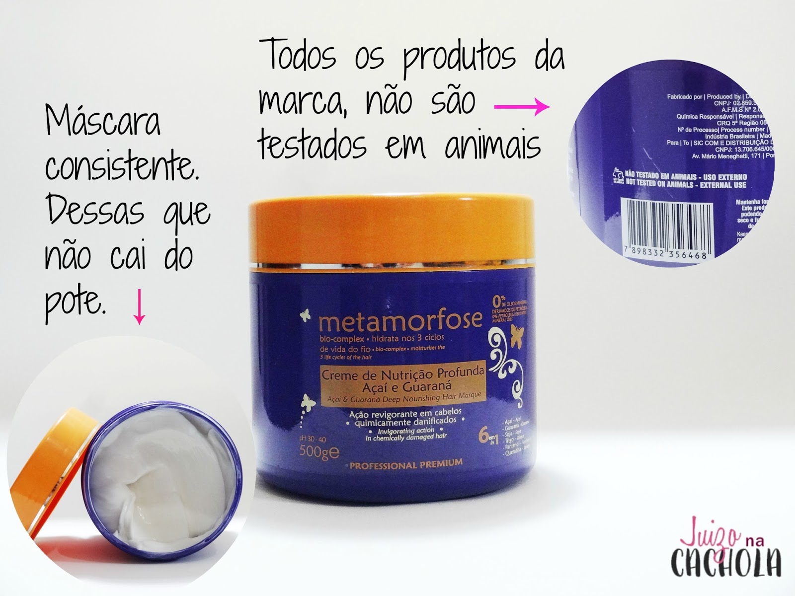 Tem um cheirinho maravilhoso, aliás, o kit todo é massa!!! A máscara Metamorfose é do tipo que gosto e indico. Bem firme, consistente e não escorre do pote. Vale lembrar que mão dentro do pote, não pode!!!!! Use uma espátula, ok? Outro fator que acho mega importante é que o produto não é testado em animais.