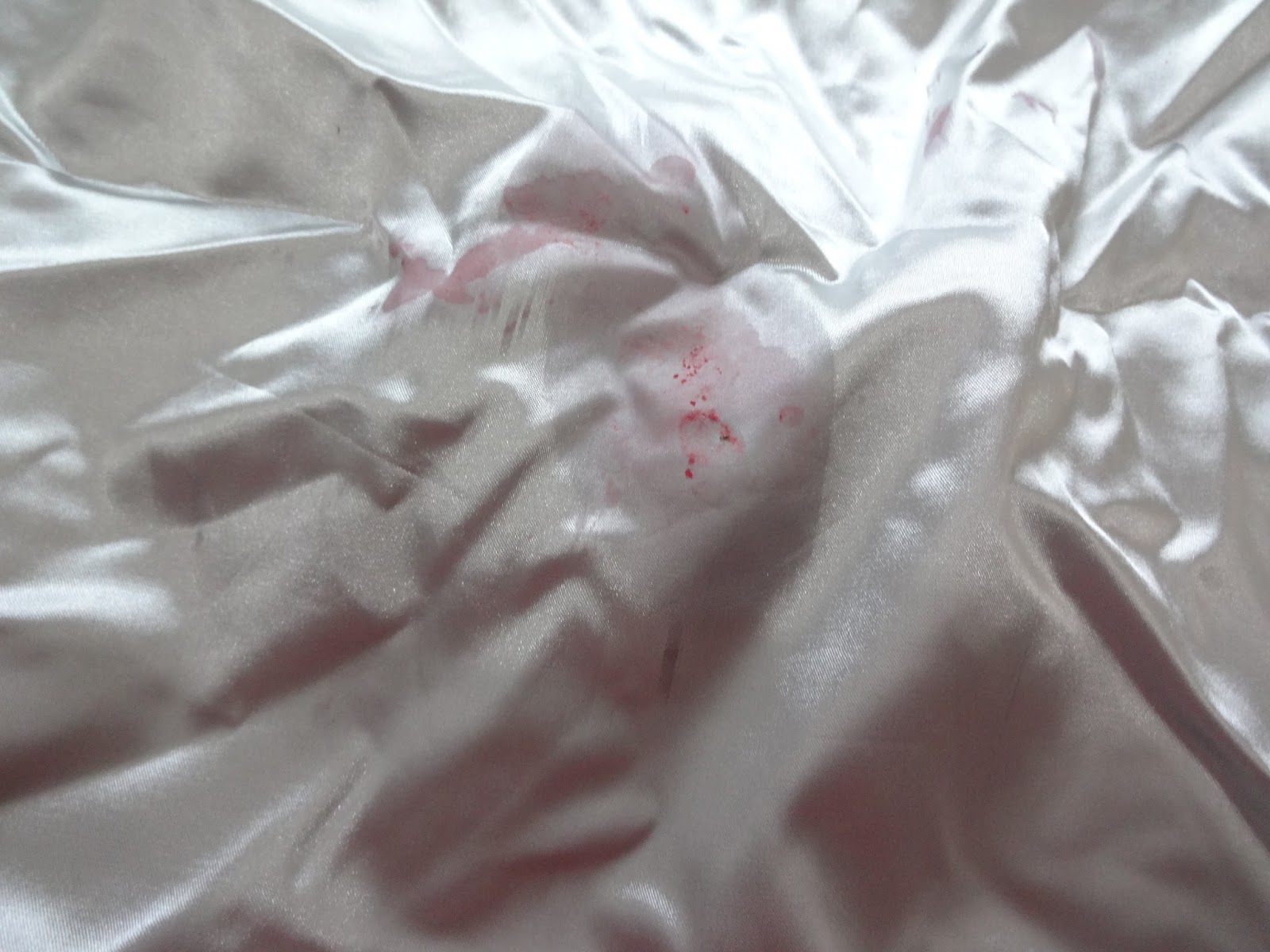 Essa toalha é de cetim. Tinha manchas de glacê, sapatos e outras não identificadas. Quando vi as manchas fiquei preocupada, afinal não lavei no ato. Esperei a mancha secar…. Mas, eu sabia que Vanish iria me ajudar… será??